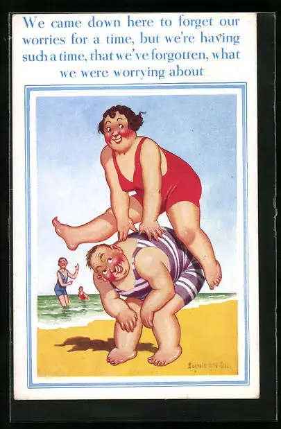 Künstler-AK Donald McGill: we`ve forgotten, what we were worrying about, Frau spring über Mann