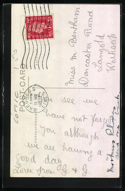 Personenbezogene Daten auf der Rückseite der Karte wurden durch blauen Textmarker unkenntlich gemacht. Die blauen Stellen sind auf die Vorderseite durchgeweicht und wirken sich negativ auf das Postkartenfoto aus
