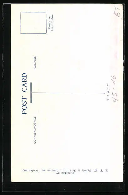 Personenbezogene Daten auf der Rückseite der Karte wurden durch blauen Textmarker unkenntlich gemacht. Die blauen Stellen sind auf die Vorderseite durchgeweicht und wirken sich negativ auf das Postkartenfoto aus