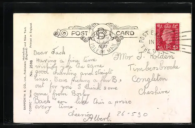 Personenbezogene Daten auf der Rückseite der Karte wurden durch blauen Textmarker unkenntlich gemacht. Die blauen Stellen sind auf die Vorderseite durchgeweicht und wirken sich negativ auf das Postkartenfoto aus