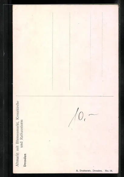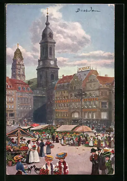 Künstler-AK Dresden, Altmarkt mit Blumenmarkt, Kreuzkirche und Rathausturm
