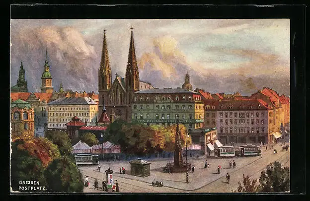 Künstler-AK Dresden, Strassenbahn auf dem Postplatz