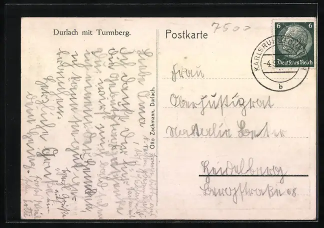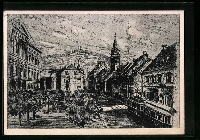 Künstler-AK Durlach, Ortsansicht mit Turmberg