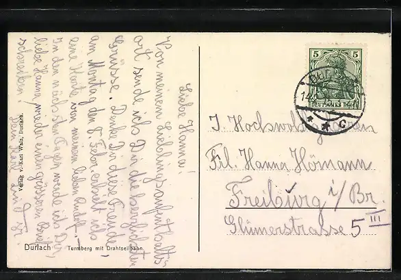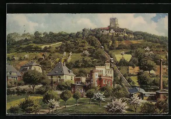 Künstler-AK Durlach, Turmberg mit Drahtseilbahn