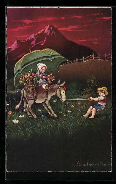 Künstler-AK E. Colombo: Junge zieht Mädchen auf einem Esel