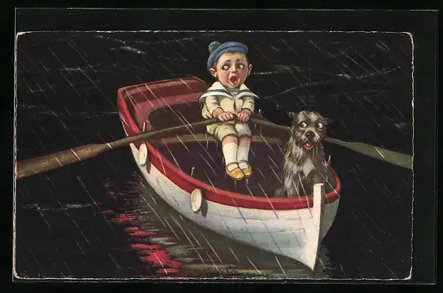 Künstler-AK E. Colombo: Kleiner Matrose und sein Hund im Ruderboot bei Regen