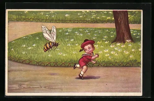 Künstler-AK E. Colombo: Knabe flüchtet vor einer Riesenwespe