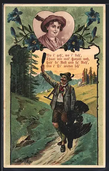 Künstler-AK E. Döcker: Alpiner Jäger mit erlegtem Auerhahn