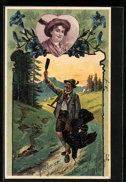 Künstler-AK E. Döcker: Dir z` Liab, Jäger mit erlegtem Auerhahn