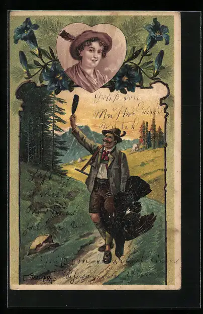 Künstler-AK E. Döcker: Dir z` Liab, Jäger mit erlegtem Auerhahn