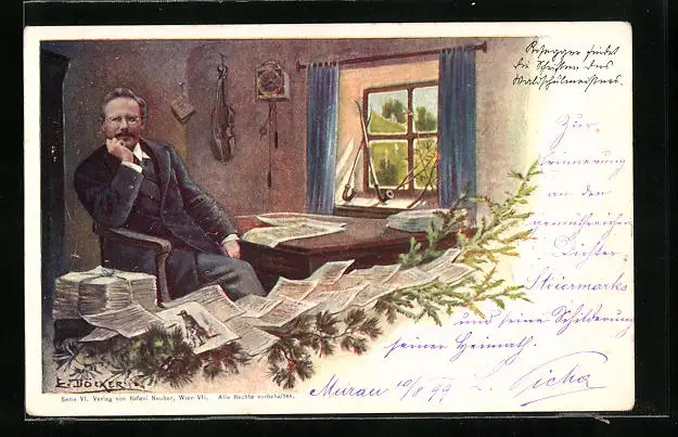 Künstler-AK E. Döcker: Heimatdichter Rosegger in seinem Arbeitszimmer
