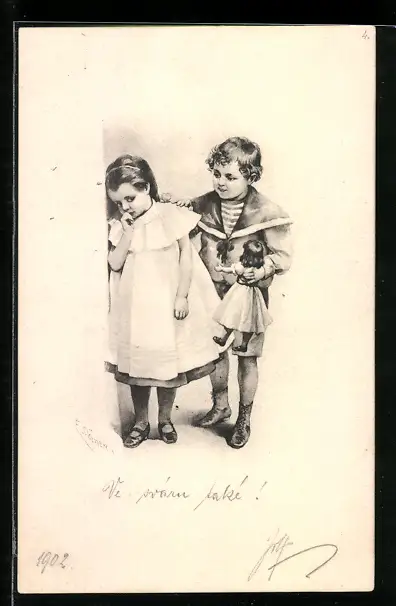 Künstler-AK E. Döcker: Junge mit Puppe tröstet Mädchen