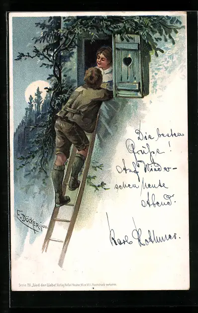 Künstler-AK E. Döcker: Mann mit einer Leiter am Fenster einer Frau
