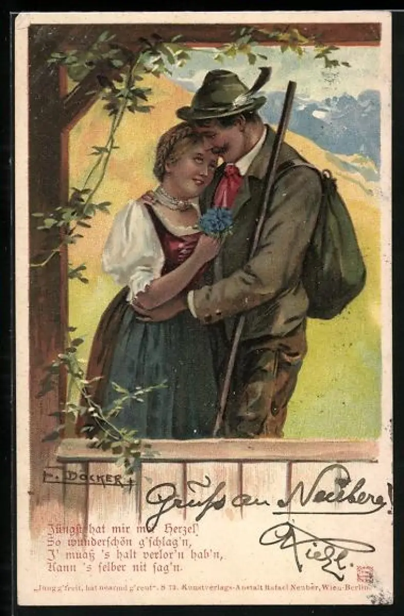 Künstler-AK E. Döcker: Wanderer umarmt eine Dienstmagd