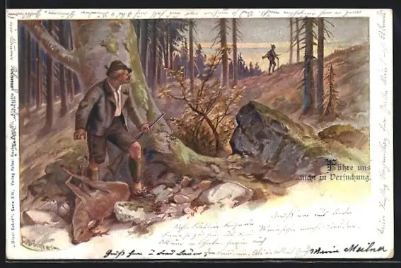 Künstler-AK E. Döcker: Wilderer mit erlegtem Rehbock versteckt sich vor dem Jäger