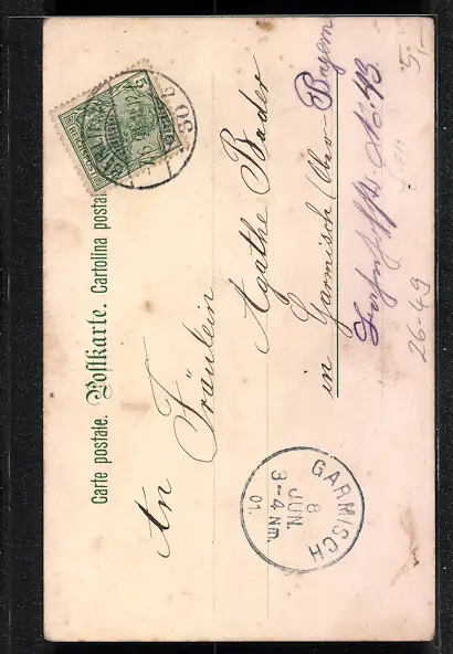 Personenbezogene Daten auf der Rückseite der Karte wurden durch blauen Textmarker unkenntlich gemacht. Die blauen Stellen sind auf die Vorderseite durchgeweicht und wirken sich negativ auf das Postkartenfoto aus