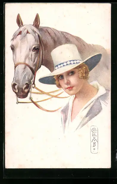 Künstler-AK E.Colombo: Junge Frau mit Hut neben ihrem Pferd