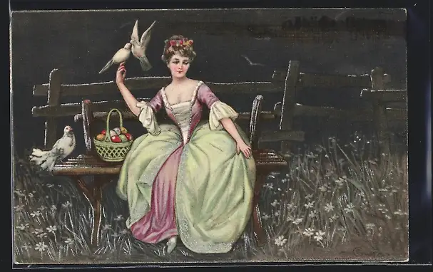 Künstler-AK E.Colombo: Tauben umflattern eine junge Frau auf einer Bank