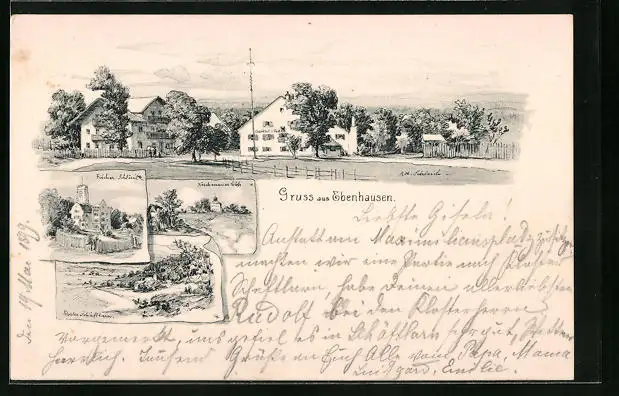 Künstler-AK Ebenhausen, Ortsansicht mit Gasthof