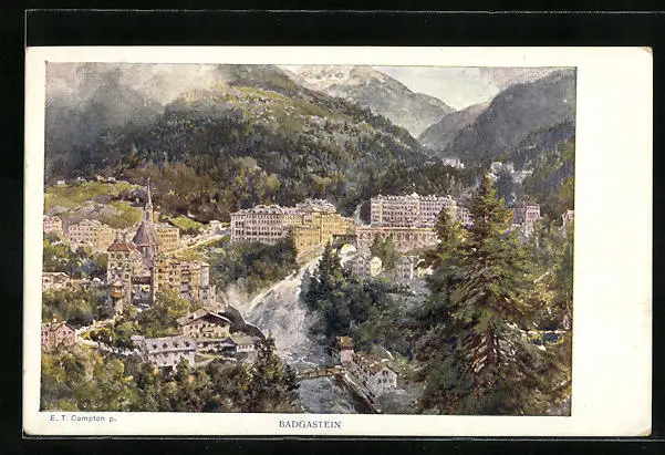 Künstler-AK Edward Theodore Compton: Badgastein, Ortsansicht aus der Vogelschau
