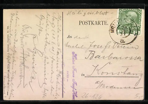 Personenbezogene Daten auf der Rückseite der Karte wurden durch blauen Textmarker unkenntlich gemacht. Die blauen Stellen sind auf die Vorderseite durchgeweicht und wirken sich negativ auf das Postkartenfoto aus