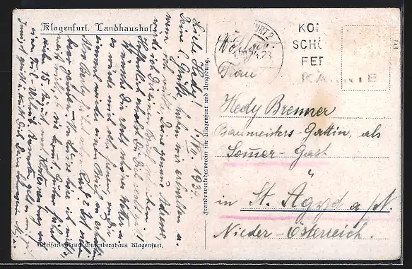 Personenbezogene Daten auf der Rückseite der Karte wurden durch blauen Textmarker unkenntlich gemacht. Die blauen Stellen sind auf die Vorderseite durchgeweicht und wirken sich negativ auf das Postkartenfoto aus