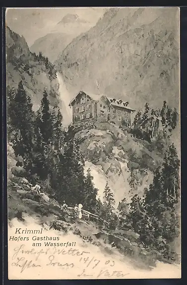 Künstler-AK Edward Theodore Compton: Krimml, Hofers Gasthaus am Wasserfall