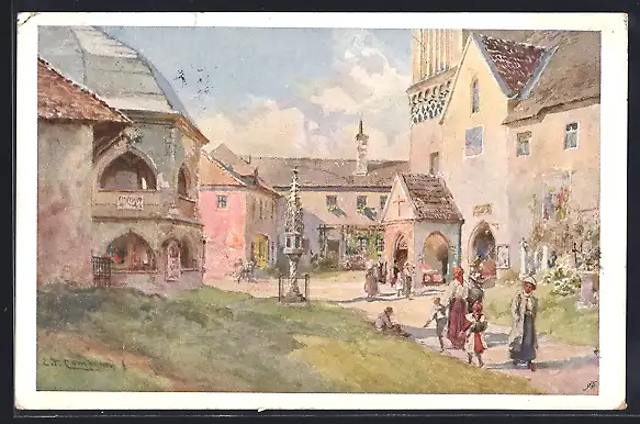 Künstler-AK Edward Theodore Compton: Maria Saal, Leute im Domhof