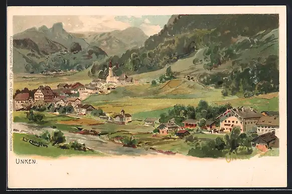 Künstler-AK Edward Theodore Compton: Unken, Ortsansicht mit Blick ins Tal
