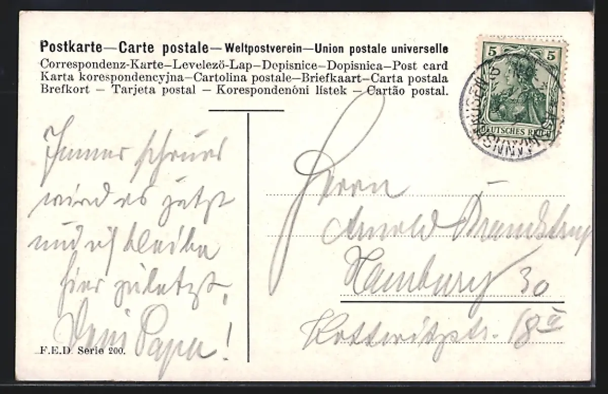 Personenbezogene Daten auf der Rückseite der Karte wurden durch blauen Textmarker unkenntlich gemacht. Die blauen Stellen sind auf die Vorderseite durchgeweicht und wirken sich negativ auf das Postkartenfoto aus
