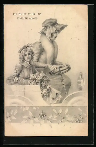 Künstler-AK Ein frohes Jahr!, Dame und Mädchen in Auto