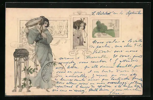 Künstler-AK Eine Frau im Kleid mit Tamburin, Jugendstil