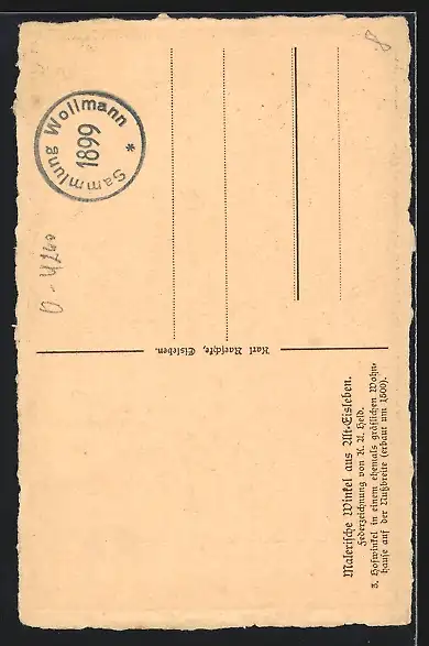 Personenbezogene Daten auf der Rückseite der Karte wurden durch blauen Textmarker unkenntlich gemacht. Die blauen Stellen sind auf die Vorderseite durchgeweicht und wirken sich negativ auf das Postkartenfoto aus
