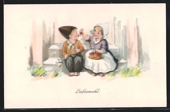 Künstler-AK Elly Frank: Liebesmahl, Kleines Paar mit Kirschen