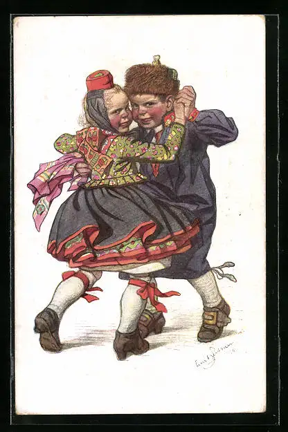 Künstler-AK Emil Beithan: Junges Pärchen in Volkstrachten beim Tanz