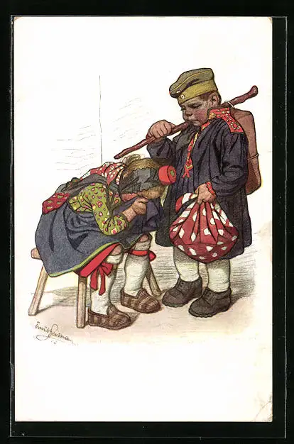 Künstler-AK Emil Beithan: Mädchen in Tracht in Trauer wird von Jungen getröstet
