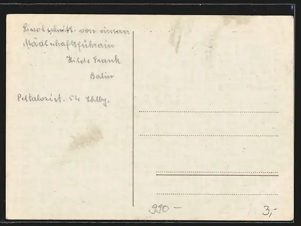 Personenbezogene Daten auf der Rückseite der Karte wurden durch blauen Textmarker unkenntlich gemacht. Die blauen Stellen sind auf die Vorderseite durchgeweicht und wirken sich negativ auf das Postkartenfoto aus