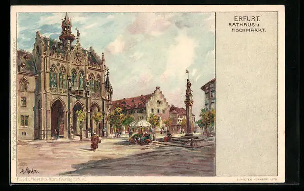 Künstler-AK Erfurt, Rathaus und Fischmarkt