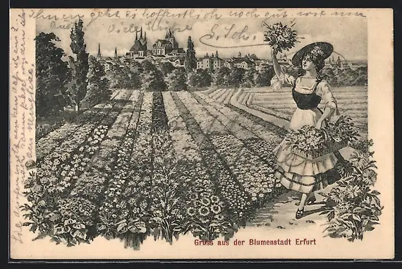 Künstler-AK Erfurt, Teilansicht mit Frau am Blumenbeet