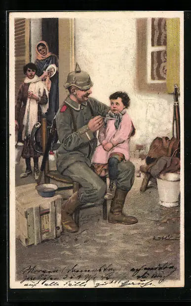 Künstler-AK Ernst Heilemann: Soldat füttert Kind