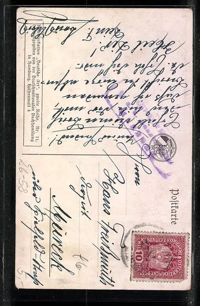 Personenbezogene Daten auf der Rückseite der Karte wurden durch blauen Textmarker unkenntlich gemacht. Die blauen Stellen sind auf die Vorderseite durchgeweicht und wirken sich negativ auf das Postkartenfoto aus