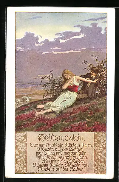 Künstler-AK Ernst Kutzer: Nr. 7, Heidenröslein, verliebtes Paar auf einer Wiese, Vers