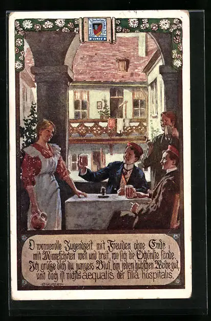 Künstler-AK Ernst Kutzer: Zechende Studenten mit junger Wirtin
