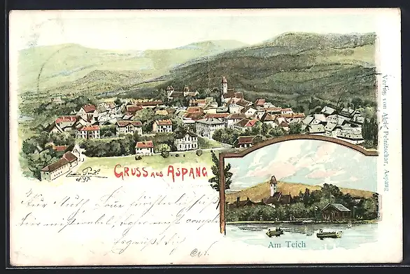 Künstler-AK Erwin Pendl: Aspang, Partie am Teich, Ortsansicht