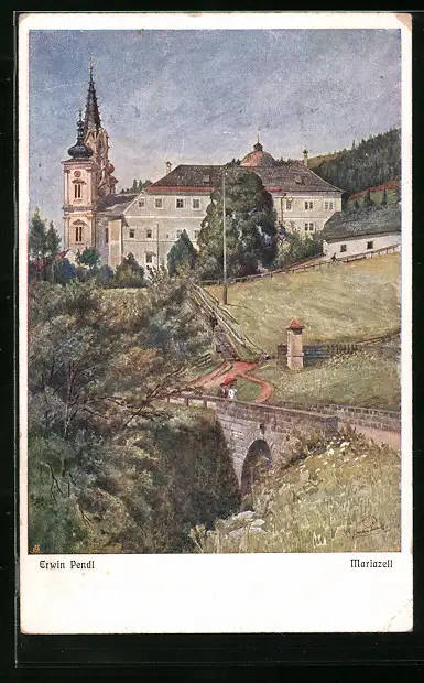 Künstler-AK Erwin Pendl: Mariazell, Teilansicht mit Kirche