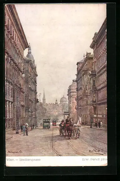 Künstler-AK Erwin Pendl: Wien, Partie in der Stadiongasse, Strassenbahn