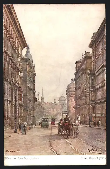 Künstler-AK Erwin Pendl: Wien, Partie in der Stadiongasse, Strassenbahn