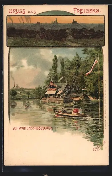 Künstler-AK Erwin Spindler: Freiberg, Schwanenschlösschen, Stadtansicht