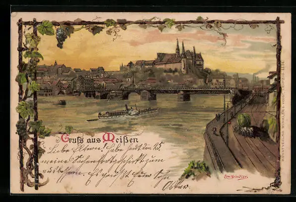 Künstler-AK Erwin Spindler: Meissen, Ortsansicht mit Fluss, Weinrebe