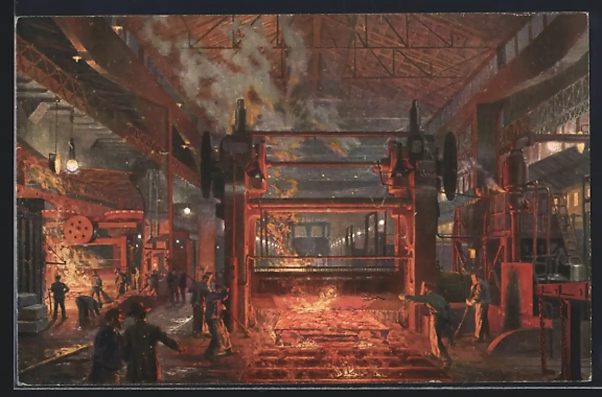 Künstler-AK Essen, Fabrikarbeiter in der Gussstahlfabrik